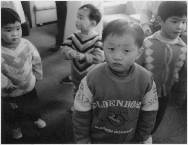 Unidentified caregiver and unidentified baby (not adopted at that time)
